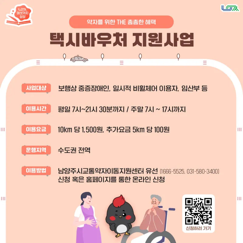 보행상 중증장애인과 일시적 비휠체어 이동자, 임산부 등 교통약자의 이동을 지원하기 위한 사업입니다. 택시바우처를 통해 10km당 1,500원, 그 후 5km당 100원의 추가 요금으로 택시를 이용할 수 있는데요, 남양주시교통약자이동지원센터 유선 신청 또는 온라인 신청을 통해 이용하실 수 있습니다.