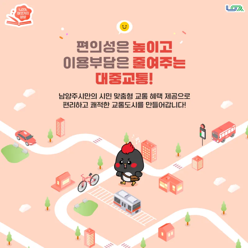 시민의 삶이 더 편리하고 더 행복할 수 있도록 남양주시는 다양한 사업들을 운영하고 있습니다. 크게 여섯 가지 분야의 중점사업들을 통해 상상 THE 이상의 남양주를 그려가고 있는데요! 오늘은 크크가 들려주는 안전하고 편리한 교통도시 남양주의 교통 혜택을 알아보고자 합니다. 어떤 것들이 있는지 지금 확인해 보세요!