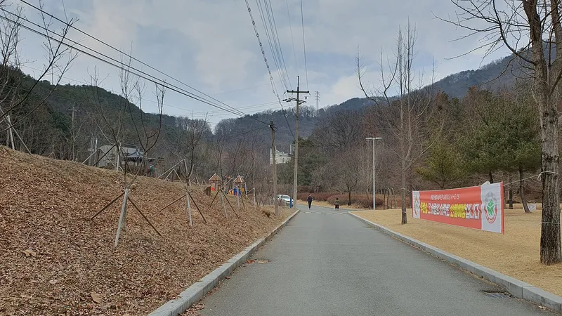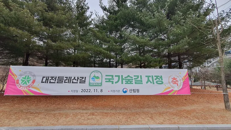 공원 내에는 국가숲길 지정을 축하하는 문구가 적힌 현수막이 걸려있습니다. 2022년 11월 8일 #대전둘레산길 이 국가숲길로 지정된 것을 알 수 있네요.