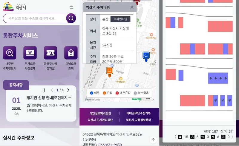 스마트 주차장을 확인하니 익산역 공용주차타워 등