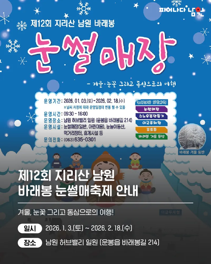 제목, 담당부서, 행정전화번호, 등록일, 조회, 장소, 기간, 내용 등으로 구성되어 있는 공연행사 게시글입니다. 제12회 지리산 남원 바래봉 눈썰매축제 안내(날짜변경) 담당부서 : 운봉읍 행정전화번호 : 063-620-3815 등록일 : 2025-12-10 조회수 : 1,428 기간 2026-01-03 ~ 2026-02-18 장소 지리산허브밸리 겨울, 눈꽃 그리고 동심으로의 여행 「제12회 지리산 남원 바래봉 눈썰매축제」가 아래와 같이 진행되오니 많은 참여바랍니다. 1. 행 사 명 : 제12회 지리산 남원 바래봉 눈썰매축제 2. ...