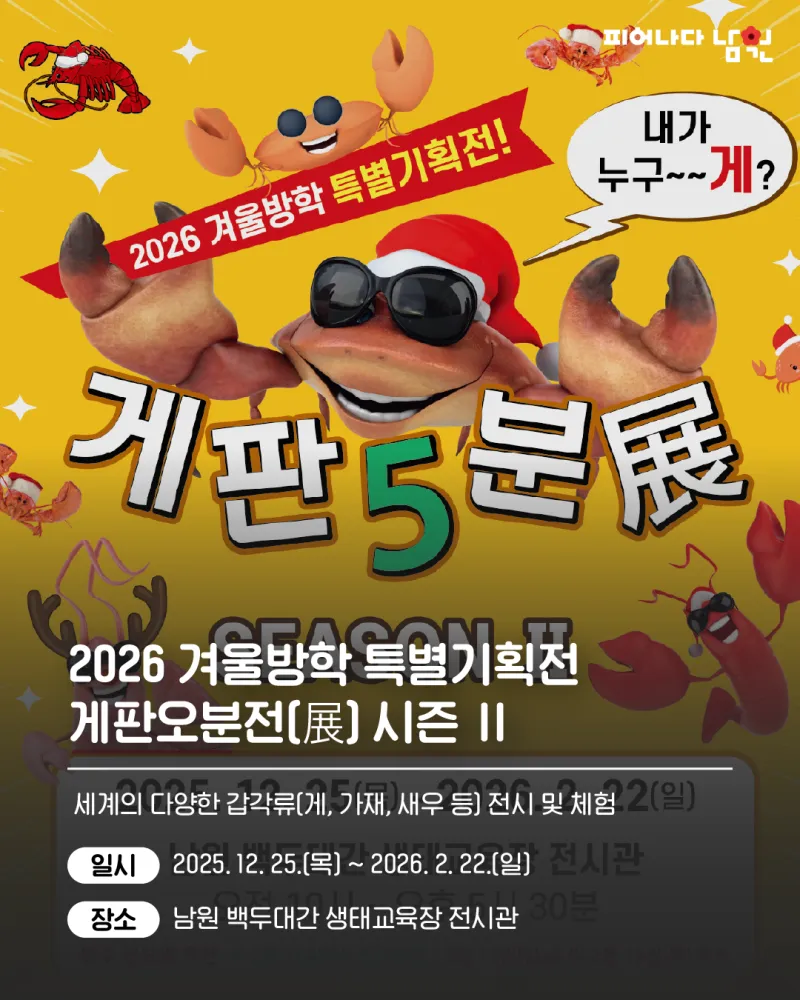 제목, 담당부서, 행정전화번호, 등록일, 조회, 장소, 기간, 내용 등으로 구성되어 있는 공연행사 게시글입니다. 2026 겨울방학 특별기획전 게판오분전(展) 시즌 Ⅱ 안내 담당부서 : 산림녹지과 행정전화번호 : 063-620-5752 등록일 : 2025-12-26 조회수 : 527 기간 2025-12-25 ~ 2026-02-22 장소 백두대간생태교육장 전시관 세계의 다양한 갑각류(게, 가재, 새우 등) 전시 및 체험 「백두대간 게판오분전(展) 시즌 Ⅱ 」를 안내하오니 많은 참여와 관람바랍니다. 1. 전시제목 : 백두대간 게판오분전...