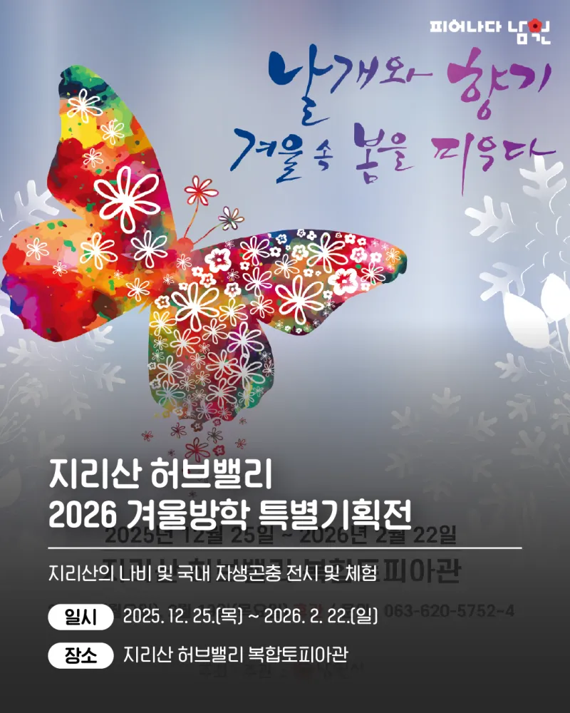 제목, 담당부서, 행정전화번호, 등록일, 조회, 장소, 기간, 내용 등으로 구성되어 있는 공연행사 게시글입니다. 지리산 허브밸리 2026 겨울방학 특별기획전 안내 담당부서 : 산림녹지과 행정전화번호 : 063-620-5752 등록일 : 2025-12-26 조회수 : 551 기간 2025-12-25 ~ 2026-02-22 장소 지리산 허브밸리 복합토피아관 겨울방학을 맞아 지리산허브밸리 내 복합토피아관에서 겨울방학 특별기획전 ‘날개와 향기, 겨울 속 봄을 피우다’를 개최하오니 많은 관람바랍니다. 1. 전시제목 : 지리산 허브밸리 202...