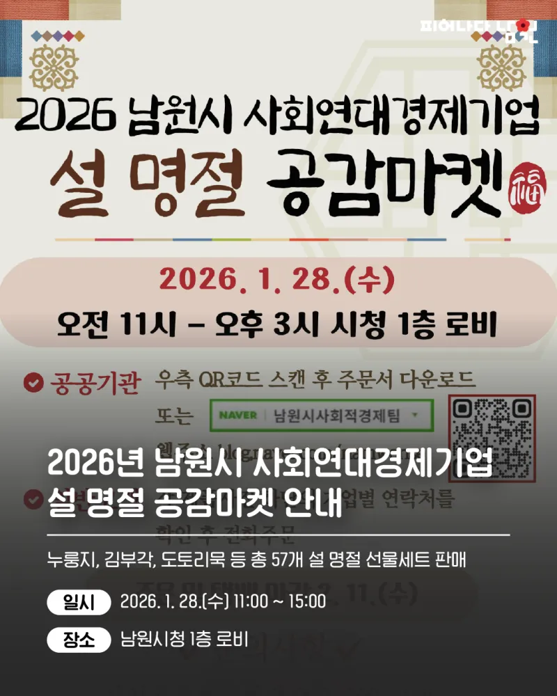 홈화면 소통과참여 시정소식 공지사항 공지사항 공유하기 URL 복사하기 프린트하기 점자솔루션 점자다운로드 제목, 담당부서, 행정전화번호, 등록일, 조회, 내용 등으로 구성되어 있는 공지사항 게시글입니다. 2026년 남원시 사회연대경제기업 설 명절 공감마켓 안내 담당부서 : 지역활력과 행정전화번호 : 063-620-5638 등록일 : 2026-01-16 조회수 : 171 남원시 사회연대경제기업에서 생산하는 제품 및 서비스 우선구매를 촉진하고 판로개척을 위해 <2026년 남원시 사회연대경제기업 설 명절 공감마켓>을 진행중이며 현장행사가 ...