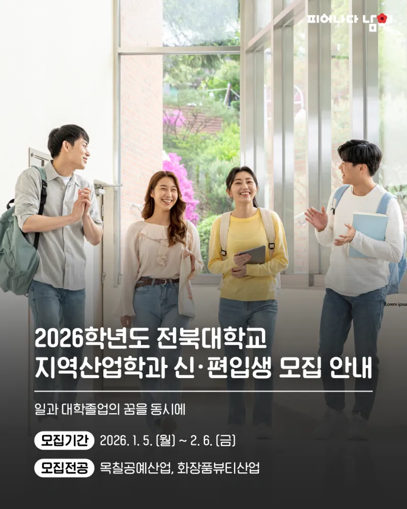 제목, 담당부서, 행정전화번호, 등록일, 조회, 내용 등으로 구성되어 있는 공지사항 게시글입니다. 2026학년도 전북대학교 지역산업학과(남원시 계약학과) 신·편입생 모집 안내 담당부서 : 교육체육과 행정전화번호 : 063-620-5607 등록일 : 2026-01-09 조회수 : 746 전북대학교 지역산업학과는 전북대와 남원시가 지원하는 재교육형 계약학과 입니다. 지역산업 활성화를 위해 목칠공예산업분야와 화장품뷰티산업분야 전문인력을 양성하는 학과로 학사학위(경영학사) 및 자격증 취득에 도움을 드리고자 2026학년도 전북대학교 지역...