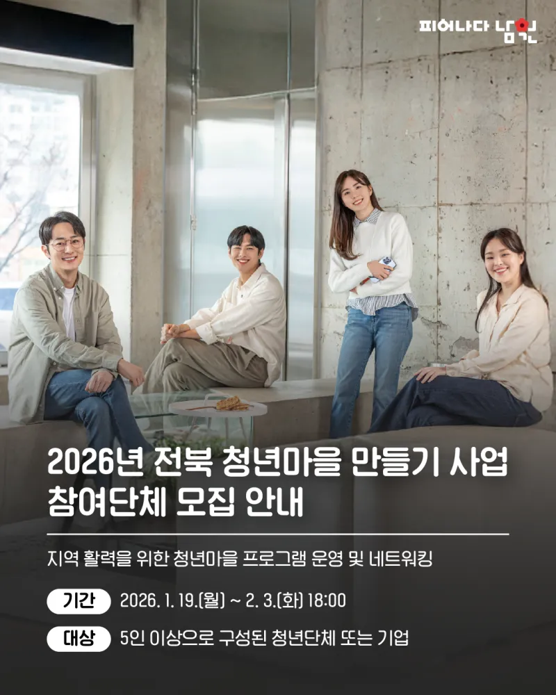 제목, 담당부서, 행정전화번호, 등록일, 조회, 내용 등으로 구성되어 있는 공지사항 게시글입니다. 2026년 전북 청년마을 만들기 사업 참여단체 모집 안내 담당부서 : 기획예산과 행정전화번호 : 063-620-6092 등록일 : 2026-01-21 조회수 : 111 청년이 중심이 되어 지역에 활력을 제고하기 위한 「2026년 전북 청년마을 만들기」 사업 참여단체를 모집하오니, 많은 관심과 참여 바랍니다. 1. 모집기간 : 2026. 1. 19.(월) ~ 2. 3.(화) 18:00 2. 모집대상 : 5인 이상으로 구성된 청년단체 또는...