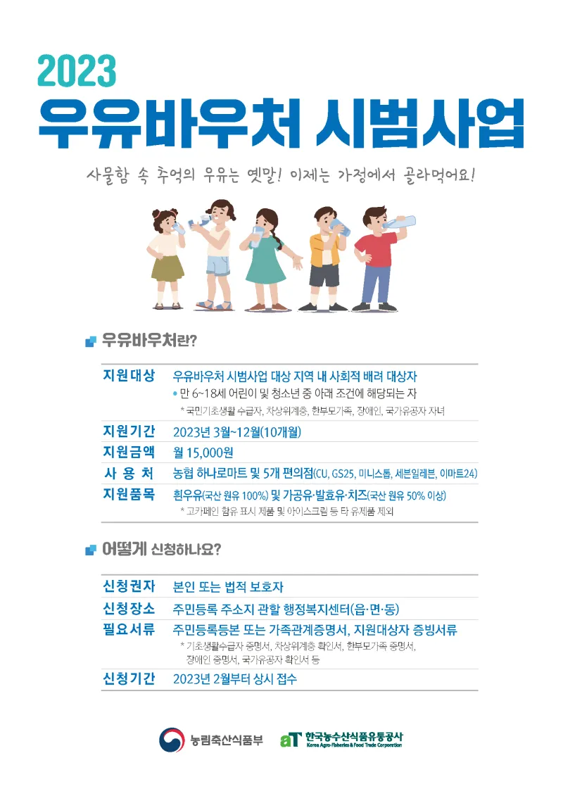 우유바우처 시범사업 대상 지역 내 사회적 배려 대상자 - 만6~18세 어린이 및 청소년 중 아래 조건에 해당되는 자 * 국민기초생활 수급자, 차상위계층, 한부모가족, 장애인, 국가유공자 자녀 |