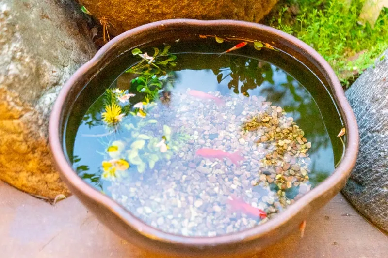도기로 만든 작은 연못 속에 물고기들이