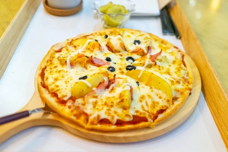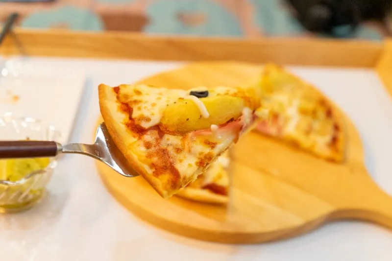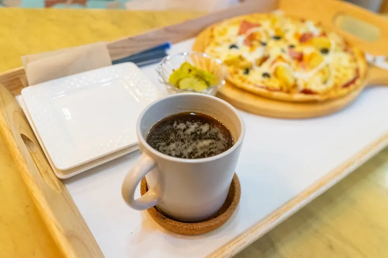 주문한 피자와 커피가 나왔어요.