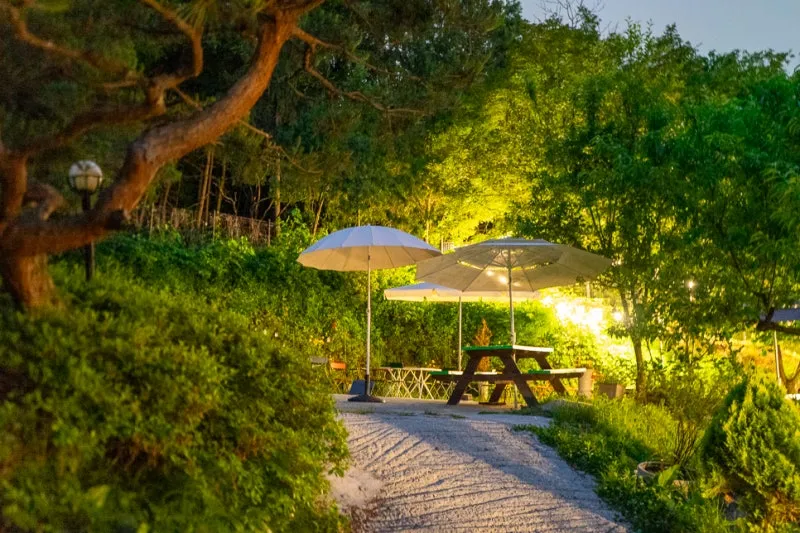 조명이 켜진 숲속 야외 테이블도