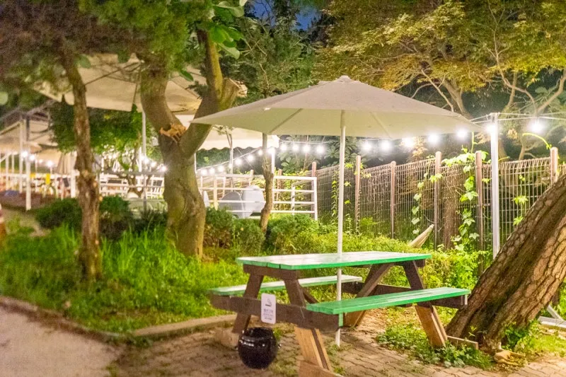 왼쪽 담장 옆에도 야외 테이블이 설치돼 있어요.