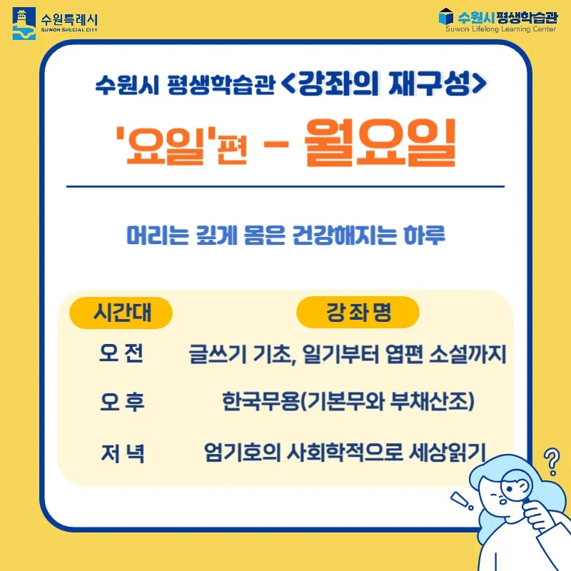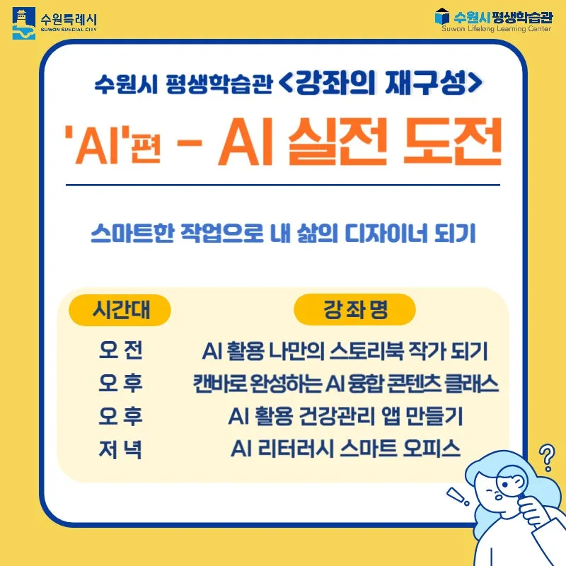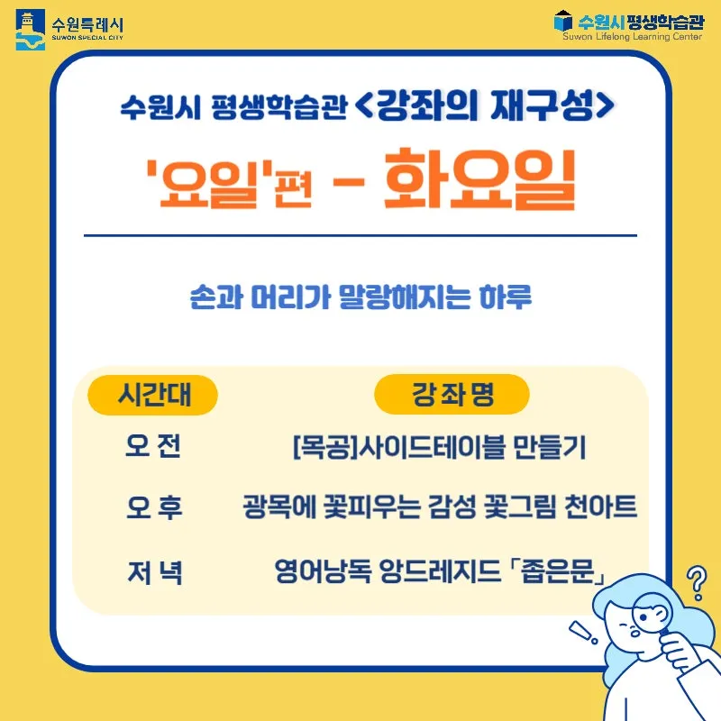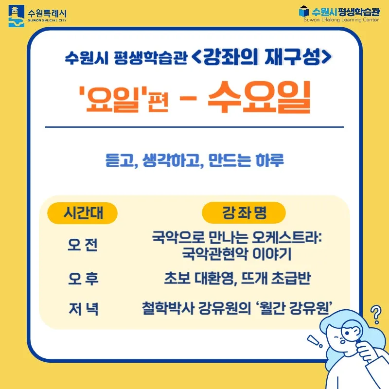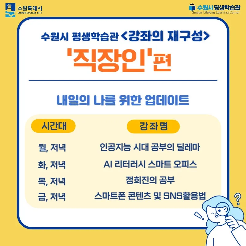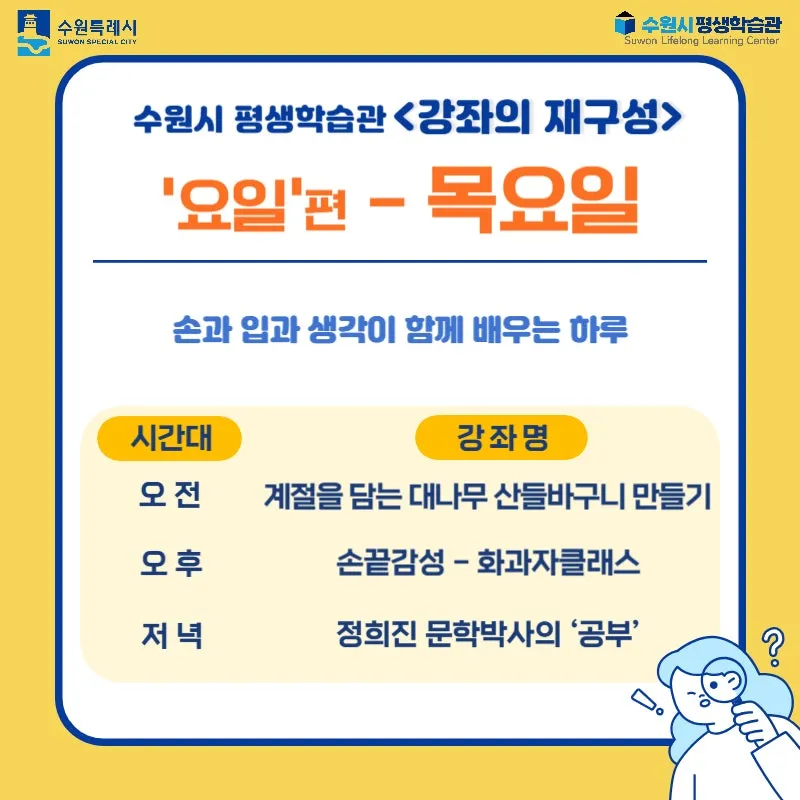 🔆진행 프로그램 ·신청 현황 등 변동이 있을 수 있으니, 자세한 내용은 수원시 평생학습관 참고