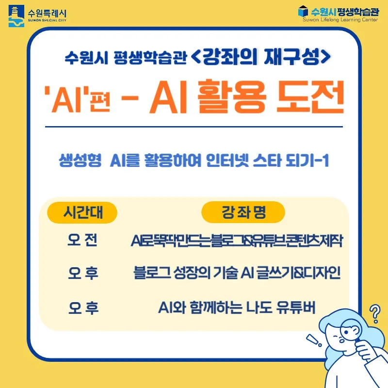 🔹AI로 뚝딱 만드는 블로그&유튜브 콘텐츠 제작 2026. 1. 5. ~ 1. 26. 월 11:00~13:00 🔹블로그 성장의 기술-AI 글쓰기 & 디자인 2026. 1. 15. ~ 3. 19. 목 13:00~14:50 🔹AI와 함께 나도 유튜버 2026. 1. 15. ~ 3. 19. 목 15:00~16:50 |
