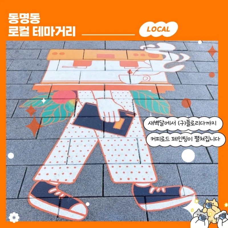 ● 사 업 명 : 동명로컬 테마거리 조성 ● 사업기간: 25. 7. ~ 11. ● 협업기간: 동명공동체상생협의회, 광주경제진흥상생일자리재단 ● 주요내용 ➊ 동명로컬 테마거리 바닥 벽화(위치:동계천로 136) ➋ 동명로컬 포토스팟 머그컵 조형물 2곳 설치 (동명동 287, 장동 120) |