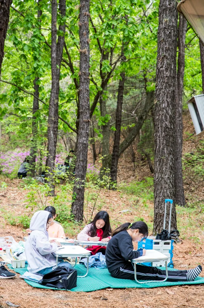 4월의 푸르른 자연속에서 지구환경을 생각하고 그림을 그리는 어린이 참가자들