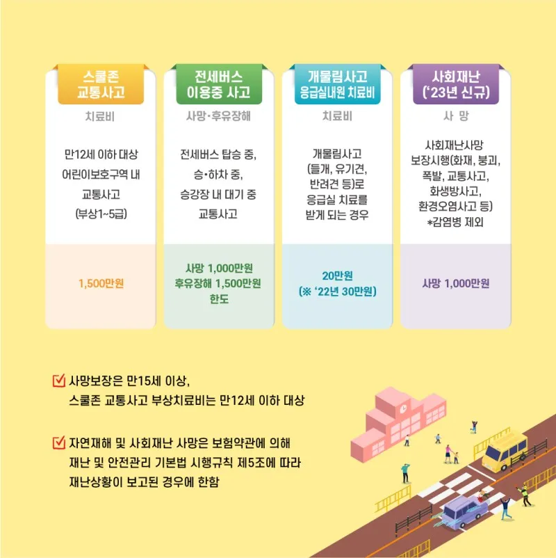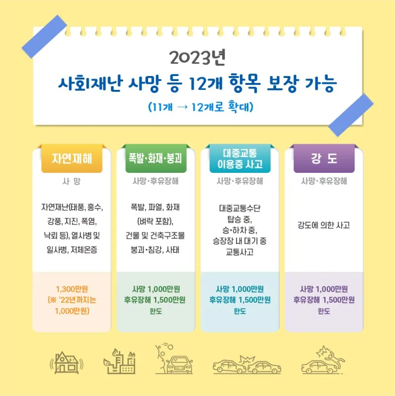 ■ 보장항목 : 자연재해・사회재난사망, 폭발・화재・붕괴사고 및 대중교통사고・전세버스사고・강도 사망 및 후유장해,