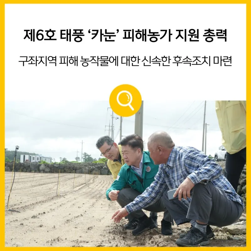 제주특별자치도는 제6호 태풍 ‘카눈’의 내습으로 피해를 입은 농가들을 대상으로 후속조치를 신속하게 지원해 피해 최소화에 집중할 방침입니다.