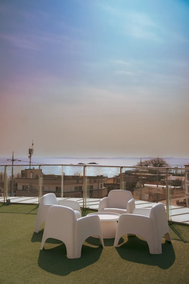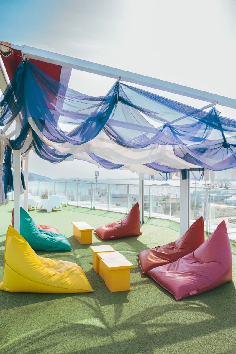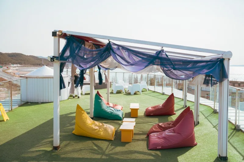 무지개색의 네모 반듯한 돌들이 있어 서해바다 뷰와 잘 어울립니다.