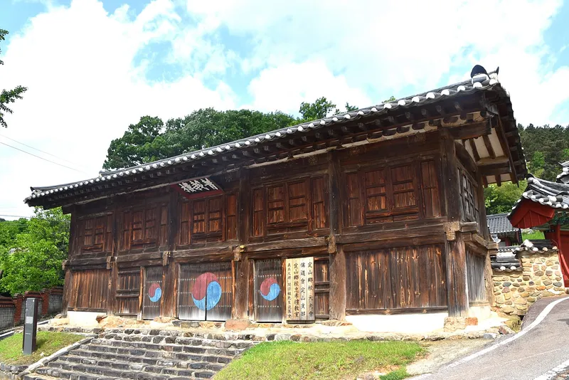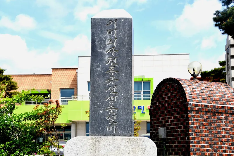 건물 앞에는 기미의사 권용규 선생 순열비가 서 있습니다. 이 기념비는 기미년 정산만세운동 당시 일본 헌병의 총에 맞고 순국하신 권흥규 선생의 충절을 기리기 위하여 1996년 천냥군에서 건립했습니다.