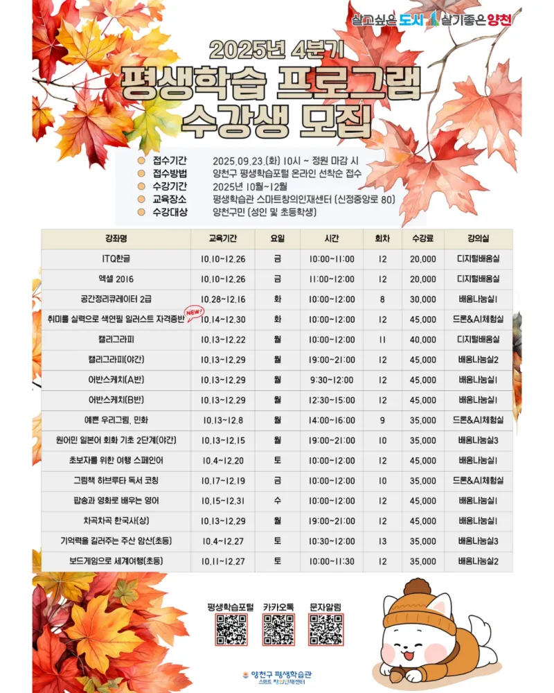 양천구 평생학습관·스마트창의인재센터 2025년 4분기 평생학습 프로그램 수강생 모집