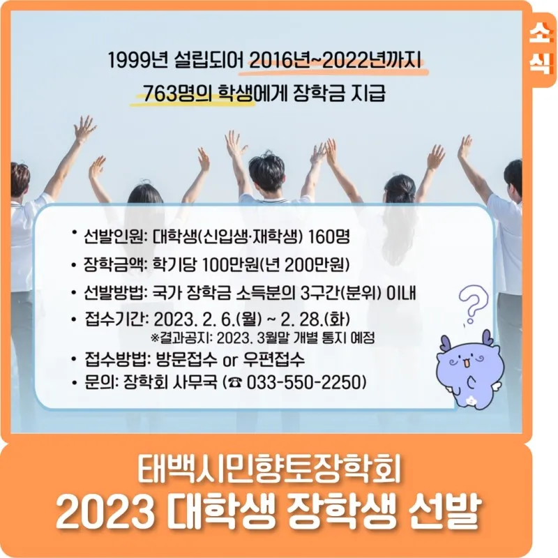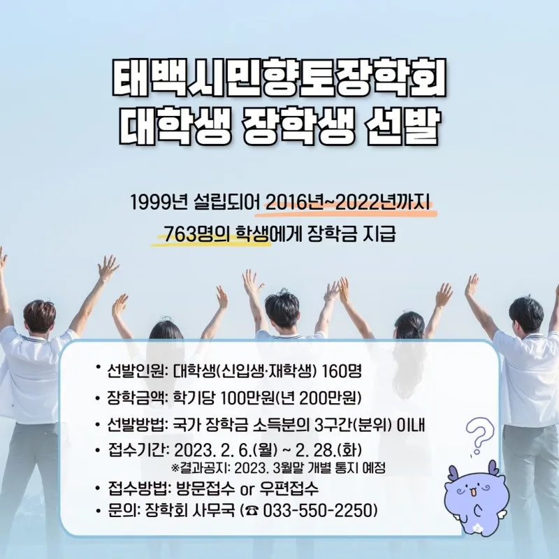 -방문 접수: 태백시청 본관 3층 교육과 내 장학회 사무국(033-550-2250)