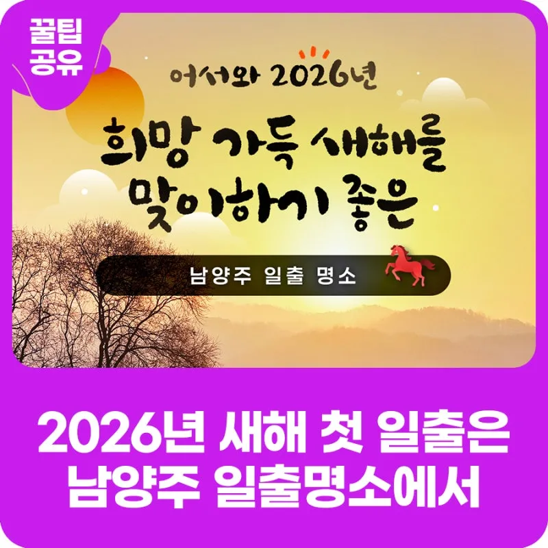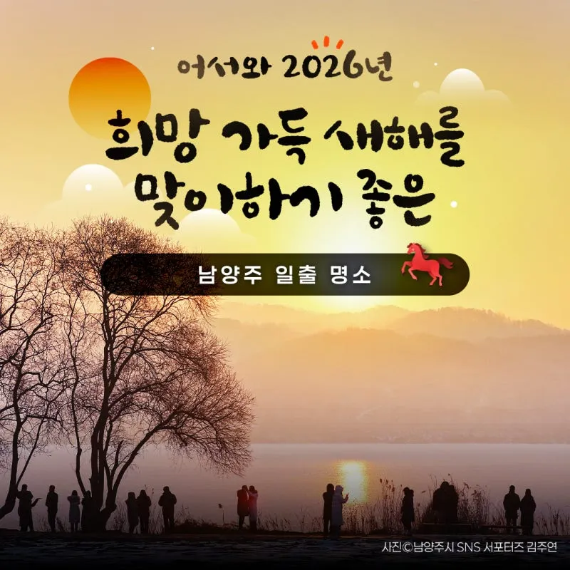 2025년도 어느덧 저물어 가고, 2026년 붉은 말의 해가 5일 앞으로 다가왔습니다. 많은 분이 새해에 처음 떠오르는 해를 보러 일출 명소를 찾으시는데요, 남양주시에도 새해 일출을 감상하기 좋은 명소들이 있습니다!