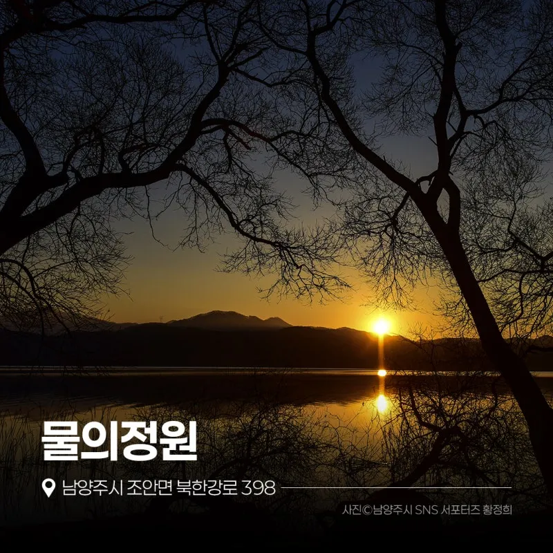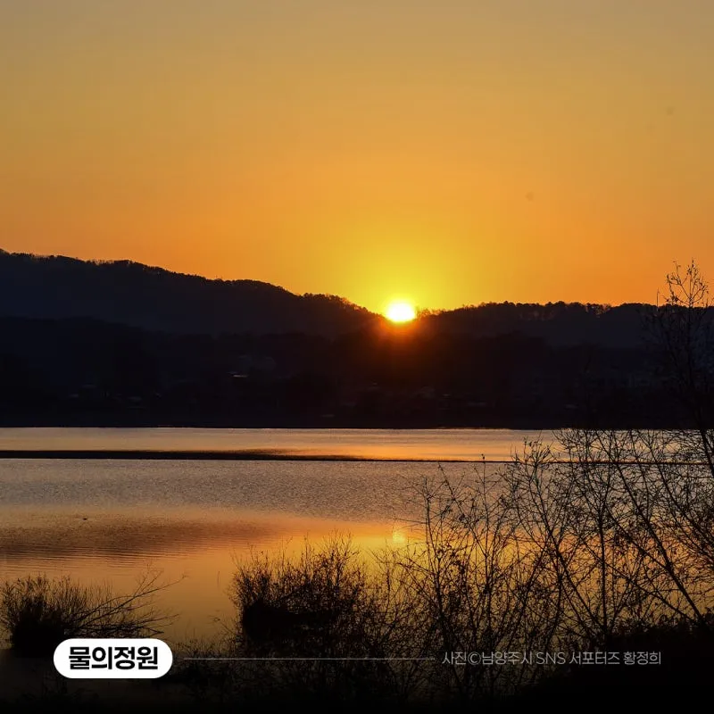 물의정원은 남양주의 대표 명소로 계절마다 각기 다른 아름다움을 만날 수 있는 곳이죠. 1월 1일이면 많은 분이 일출을 보기 위해 방문하는 곳이기도 합니다! 물의정원 뱃나들이교는 사진을 취미로 하시는 분들이 멋진 일출 사진을 찍기 위한 스팟으로도 사랑받고 있는데요, 서서히 떠오르는 해가 한강과 만나 빛나는 모습이 장관이랍니다! 물의정원은 운길산역과도 가까워 대중교통을 이용해 쉽게 방문할 수도 있으니 교통혼잡이나 주차난이 신경 쓰이신다면 대중교통을 이용하셔도 좋을 것 같습니다!