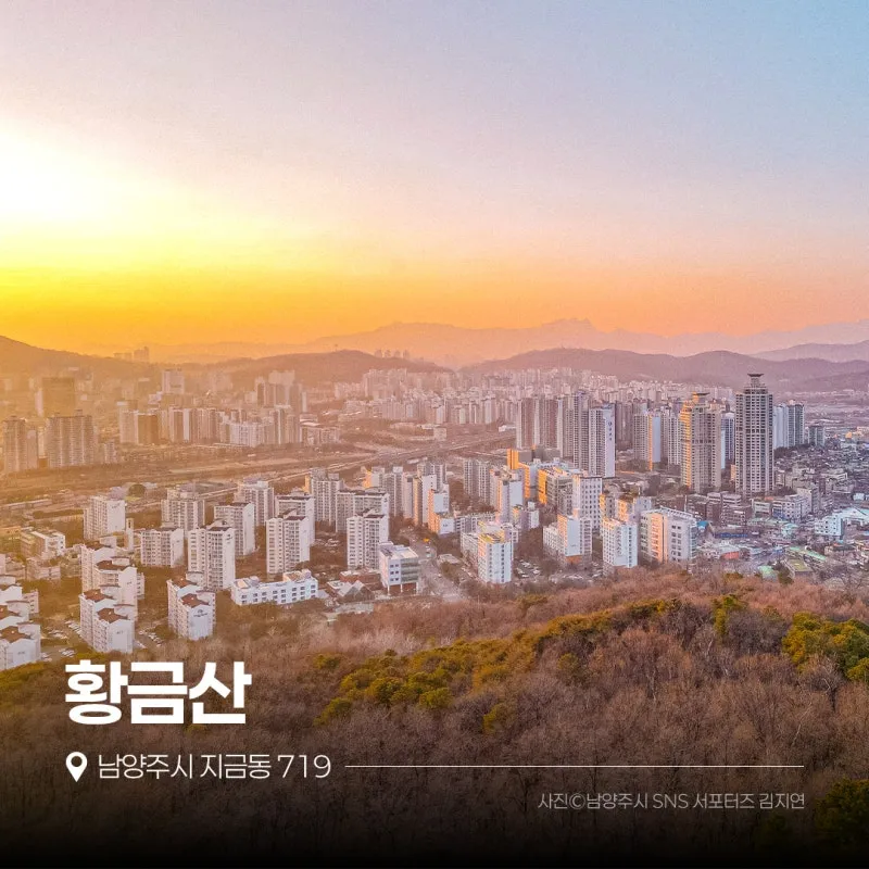 한강과 도심의 멋진 전망을 만날 수 있는 남양주의 숨은 명소 황금산 또한 남양주 일출 명소로 손꼽히는 곳인데요, 해발 128.6m의 야트막한 산으로 누구나 쉽게 오를 수 있어 이른 아침에도 부담 없이 방문해 일출을 감상할 수 있습니다. 15~20분 정도 정비된 산책로를 걷다 보면 황금산전망대를 만날 수 있는데요, 도심 사이로 떠오르는 일출이 또 다른 매력으로 다가온답니다~ 황금산에 올라 첫 일출을 보며 새해 소원을 빌어보세요!
