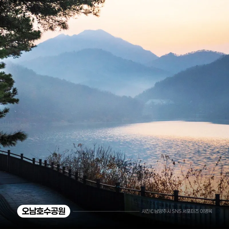 호수 위로 떠 오르는 잔잔한 물안개와 능선 사이로 떠오르는 일출이 장관을 이루는 곳 바로 오남호수공원입니다! 얼마 전 새 단장을 하여 크크와 낙낙 조형물도 만날 수 있는 곳인데요~ 농업용수를 위해 만들어진 저수지를 공원화하여 호수 둘레길을 따라 걸으며 병풍처럼 둘러싸고 있는 산과 호수를 보며 물멍하기 좋습니다. 특히 아침에는 물안개가 신비로움을 자아내고, 일출 때는 능선 사이로 올라오는 해와 호수에 반짝이는 윤슬이 아름다운데요~ 오남호수공원에서 멋진 일출 감상해 보시는 건 어떨까요?