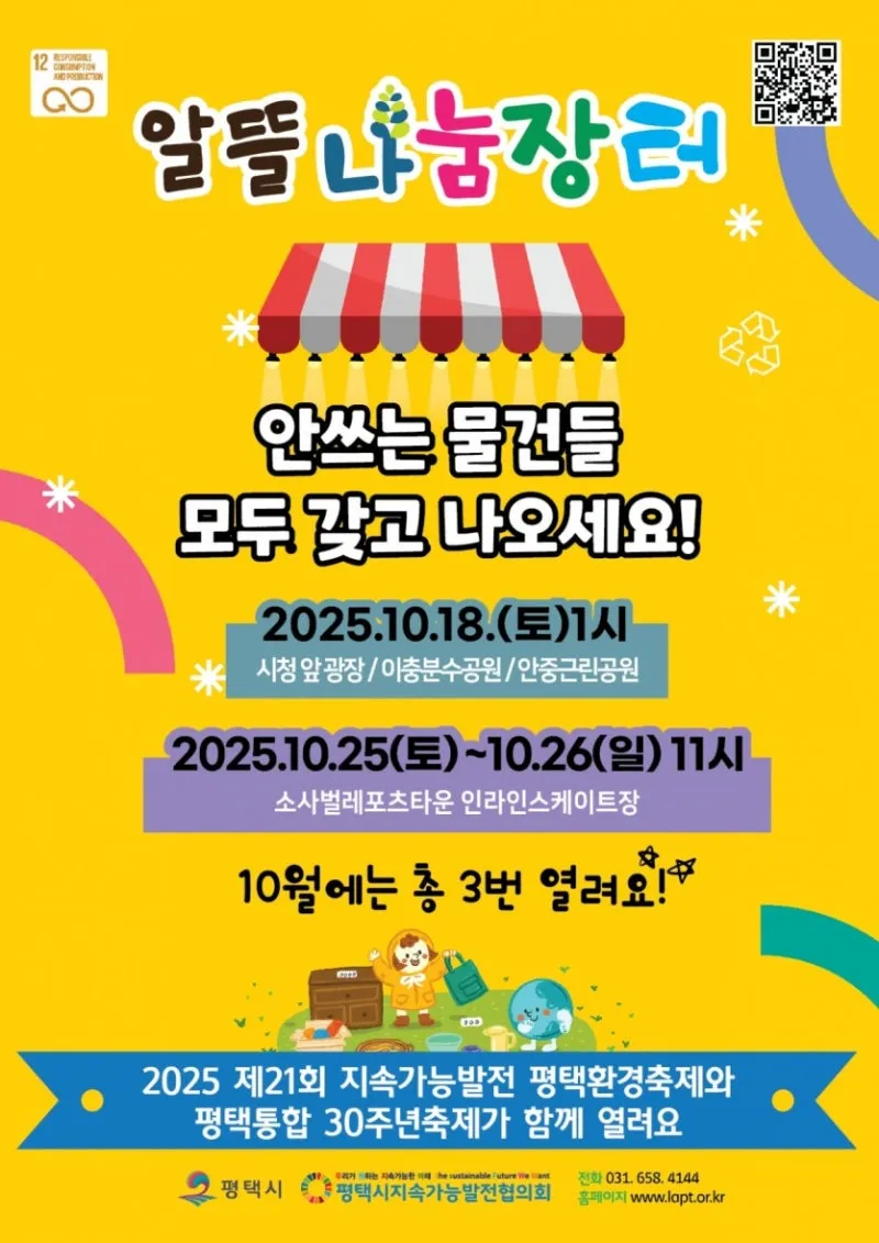#평택시 #알뜰나눔장터 #10월행사 #평택환경축제 #평택통합30주년 #플리마켓 #중고나눔 #지속가능한소비 #제로웨이스트 #친환경생활 #재사용 #나눔문화 #평택시지속가능발전협의회 #가을축제 #평택시청 #소사벌레포츠타운 #안중근린공원 #이충분수공원 #평택이벤트