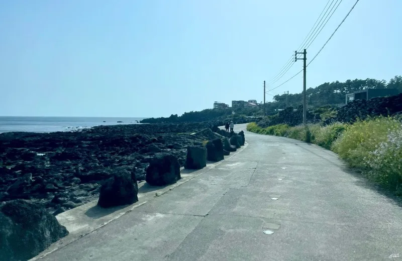 주차 후 오른쪽 대평포구 방향으로 시원하게 쭉 뻗어있는 해안길을 따라 걷기 시작해요. 제주 올레길에 속해 있는 곳으로, 길이 평탄하고 잘 닦여 있어 날씨가 좋을 때면 이곳을 걷는 사람들을 많이 만날 수 있어요.