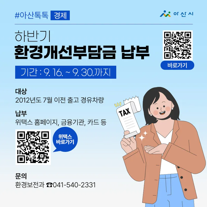 <9월은 환경개선부담금 정기분 납부의 달> 1. 부과대상 : 2012년 7월 이전에 출고된 경유 자동차의 소유자 2. 부과대상기간 : 2025.1.1. ~ 2025.6.30.(6개월간 사용분) 3. 납부기간 : 2025.9.16. ~ 2024.9.30. *환경개선부담금은 후납제의 성격으로 6개월간 사용분에 대해 약 3개월 후 고지 4. 납부방법 : 간단e납부(위택스), 신용카드, 금융기관, 가상계좌, 인터넷 지로납부, 자동이체(신청자에 한함) 5. 문의전화 : 아산시청 환경보전과 (☎041-540-2331)