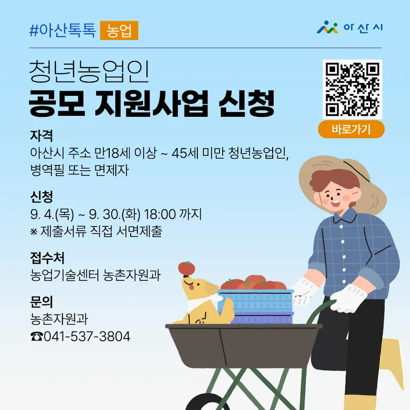 자격 : 아산시 주소 만18세 이상 ~ 45세 미만 청년농업인, 병역필 또는 면제자