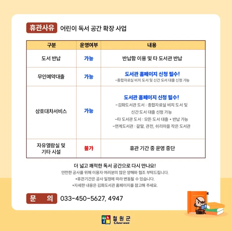 어린이 독서 공간 확장 공사로 인해 김화도서관이 임시 휴관에 들어갑니다.
