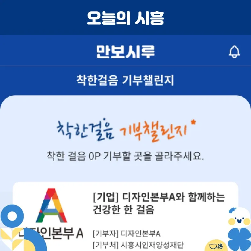 ‘만보시루 기부챌린지’는 걷기 앱을 통해 사용자가 걸음 수 포인트를 적립하고 이를 원하는 기부처에 기부할 수 있는 시민 참여형 건강 기부 캠페인입니다. 시민들이 걷기를 통해 건강을 챙기면서 동시에 지역사회 나눔에도 동참할 수 있어 큰 호응을 얻고 있습니다.