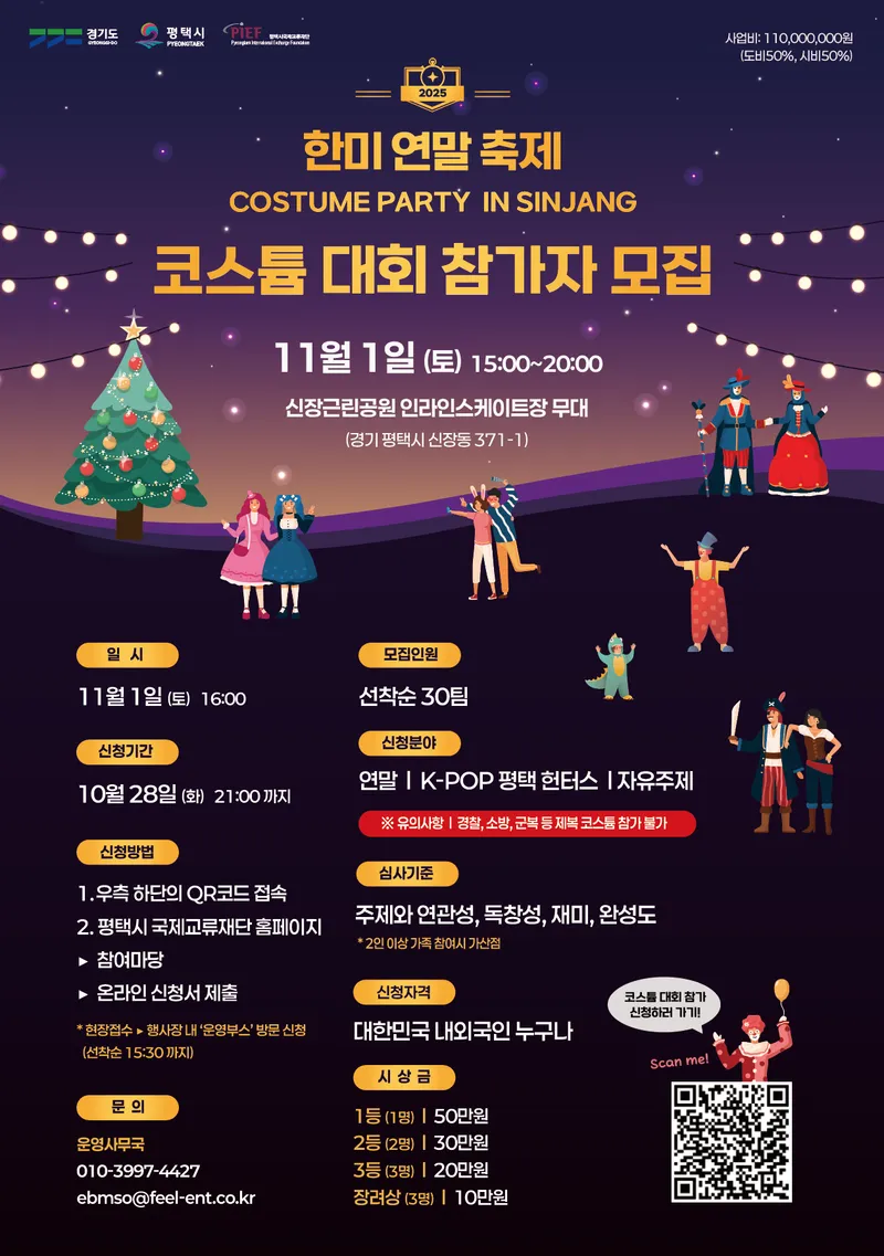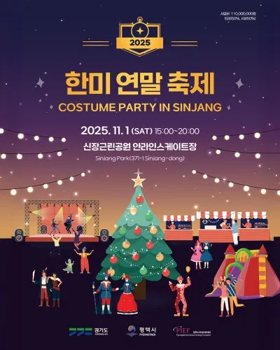 2025 한미 연말 축제 – 코스튬 파티 i... 시민행사 한국어 영어 제 점수는요! 점수 선택 점수주기 2025 한미 연말 축제 – 코스튬 파티 in 신장 (11/1) Costume Party in Sinjang 분야(장르) 이벤트 행사기간 2025-11-01 시간 15:00 ~ 20:00 장소 신장근린공원 인라인스케이트장 (신장동 371-1) Sinjang Park (371-1 Sinjang-dong) 문의 031-667-2353 주관/주최 평택시국제교류재단 / 경기도, 평택시 Pyeongtaek International Exc...