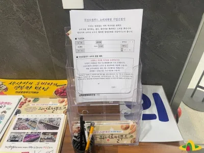 입구를 따라 들어가면 입구가 또 있고 직매장에 판매되고 있는 의성에서 농사를 짓고 계시는 생산자들의 얼굴이 한편에 보입니다. 소비자 회원 가입 신청서도 보이네요~