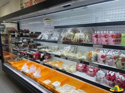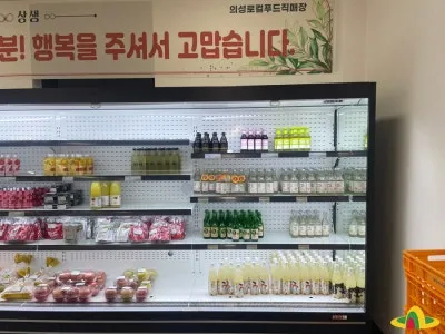 입구에서 보이는 가장 정면 냉장 쇼케이스에는 의성에서 생산되는 농산물로 만든 소주가 있고, 과일로 만든 과일 음료와 신선 과일들이 있답니다. 그리고 계란 등 사과즙이랑 다양하게 있었어요~