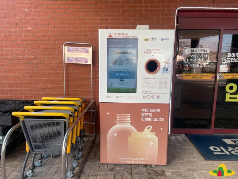 의성읍에 위치한 로컬푸드 직매장 앞에는 사용한 플라스틱 페트병과 음료 캔을 넣으면 포인트로 바꿔주는 기계가 있답니다.