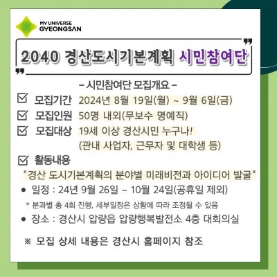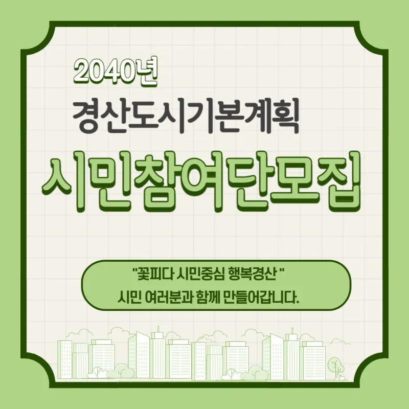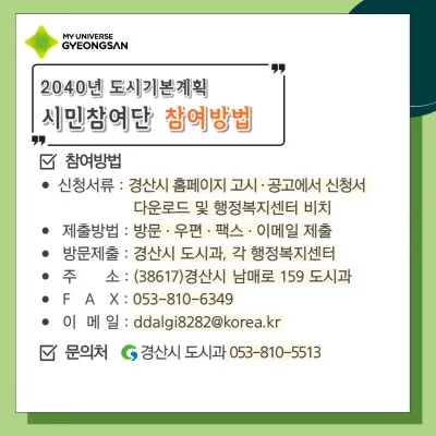 - 모집대상 : 19세 이상 경산시민 누구나! (관내 사업자, 근무자 및 대학생 등)