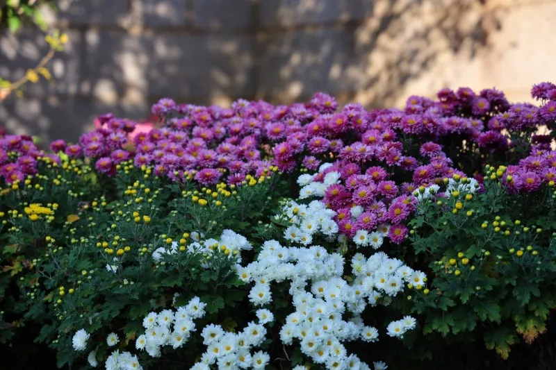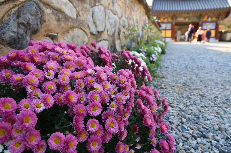 표충사의 가을을 느낄 수 있는 포인트는 멀리 보이는 산의 색깔 변화와 가까이에 만개한 국화등 사방이 가을의 요소들입니다. 낮게 핀 국화도 한눈에 들어옵니다.