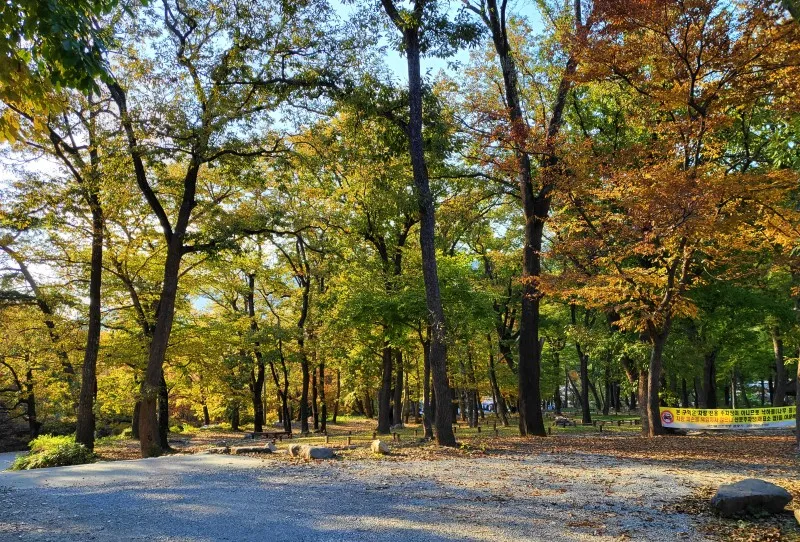 주차공간 내 화장실 건물옆에도 아주 큰 나무가 있었네요. 노랗게 물든 나무가 반겨주는 듯 시선을 끕니다. 다른 계절에는 크게 눈에 띄지 않았는데 빛이 잘 드는 곳에서 예쁘게 물들어 있어요.