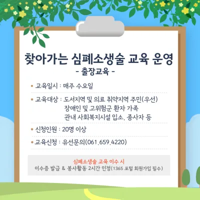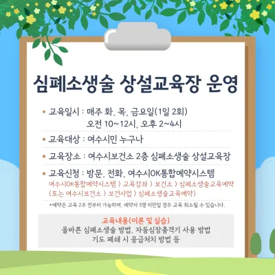 {"title":"여수시보건소! 심폐소생술 교육 운영","source":"https://blog.naver.com/yeosu_city/223388215415","blogName":"여수시 공..","blogId":"yeosu_city","domainIdOrBlogId":"yeosu_city","logNo":223388215415,"smartEditorVersion":4,"meDisplay":true,"lineDisplay":true,"outsideDisplay":true,"cafeDisplay":true,"blogDisplay":true}