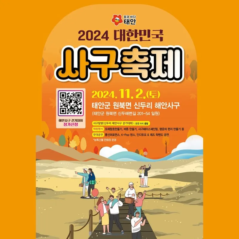 국내 최대의 해안사구! 신두리 해안사구에서 2024 대한민국 사구 축제가 2024년 11월 2일 토요일에 개최됩니다. 한국의 사막이라 불리는 신두리 해안사구에서 해안사구 걷기대회부터 모래 향초 만들기, 버튼 만들기 등 다양한 체험활동과 무대공연이 있을 예정이오니 많은 관심 부탁드립니다!