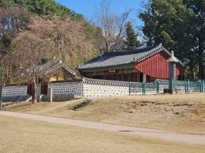 송산사는 여섯명의 고려 충신들의 위패를 모신 사당인데요. 한옥 너머 산수유나무와 배롱나무도 빼곡하게 심어져 있어 더욱 시원한 느낌을 줍니다. 소나무숲과 전통정원, 너른 잔디밭도 빼놓을 수 없어요!