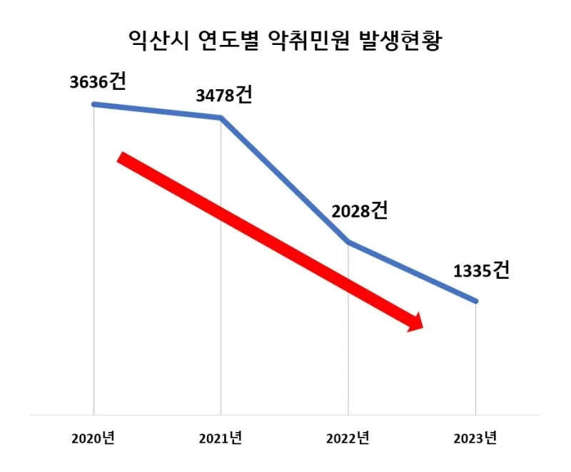 실제 익산시에 접수된 연도별 악취 민원 발생 건수는 △2020년 3,636건 △2021년 3,478건 △2022년 2,028건 △2023년 1,335건으로 약 63% 감소했다.