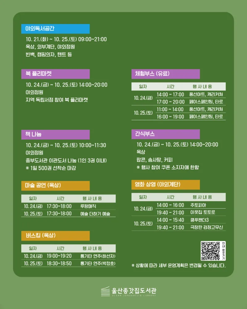 📚주요내용: 야외 독서공간 조성, 영화 상영, 공연, 책 나눔 등