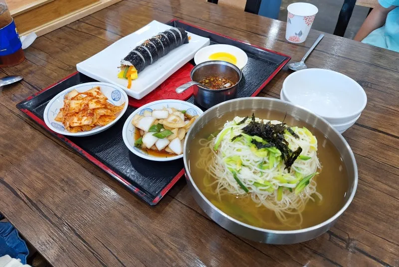 주문한 잔치국수와 김밥, 반찬류가 나왔는데요.