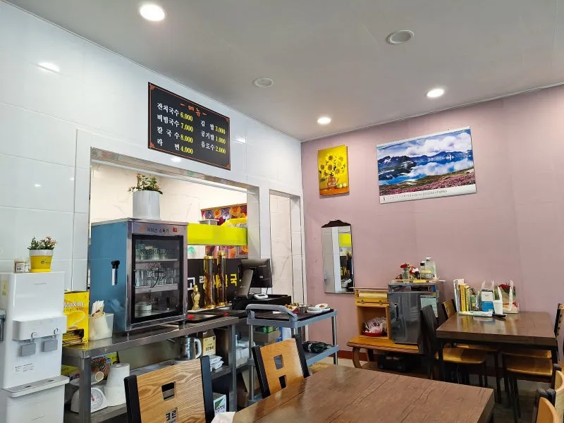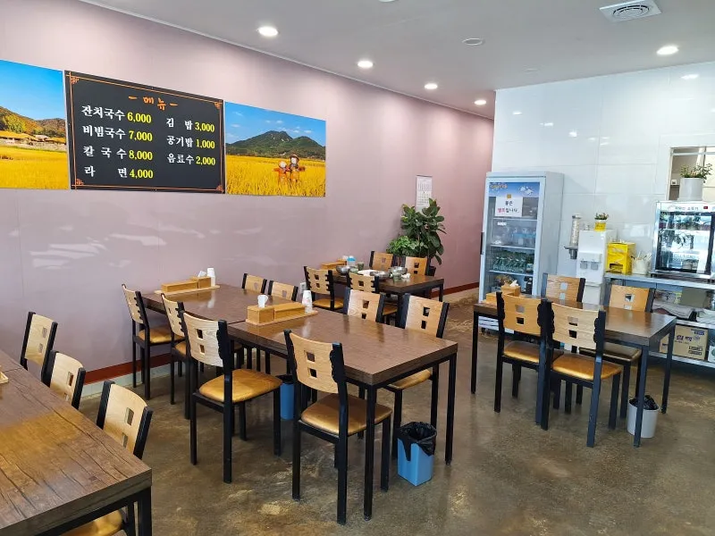 메뉴는 잔치국수, 비빔국수, 칼국수, 라면, 김밥 등으로