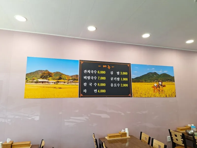 따뜻함이 묻어나는 시골 풍경 사진과 함께 메뉴판이 보입니다.